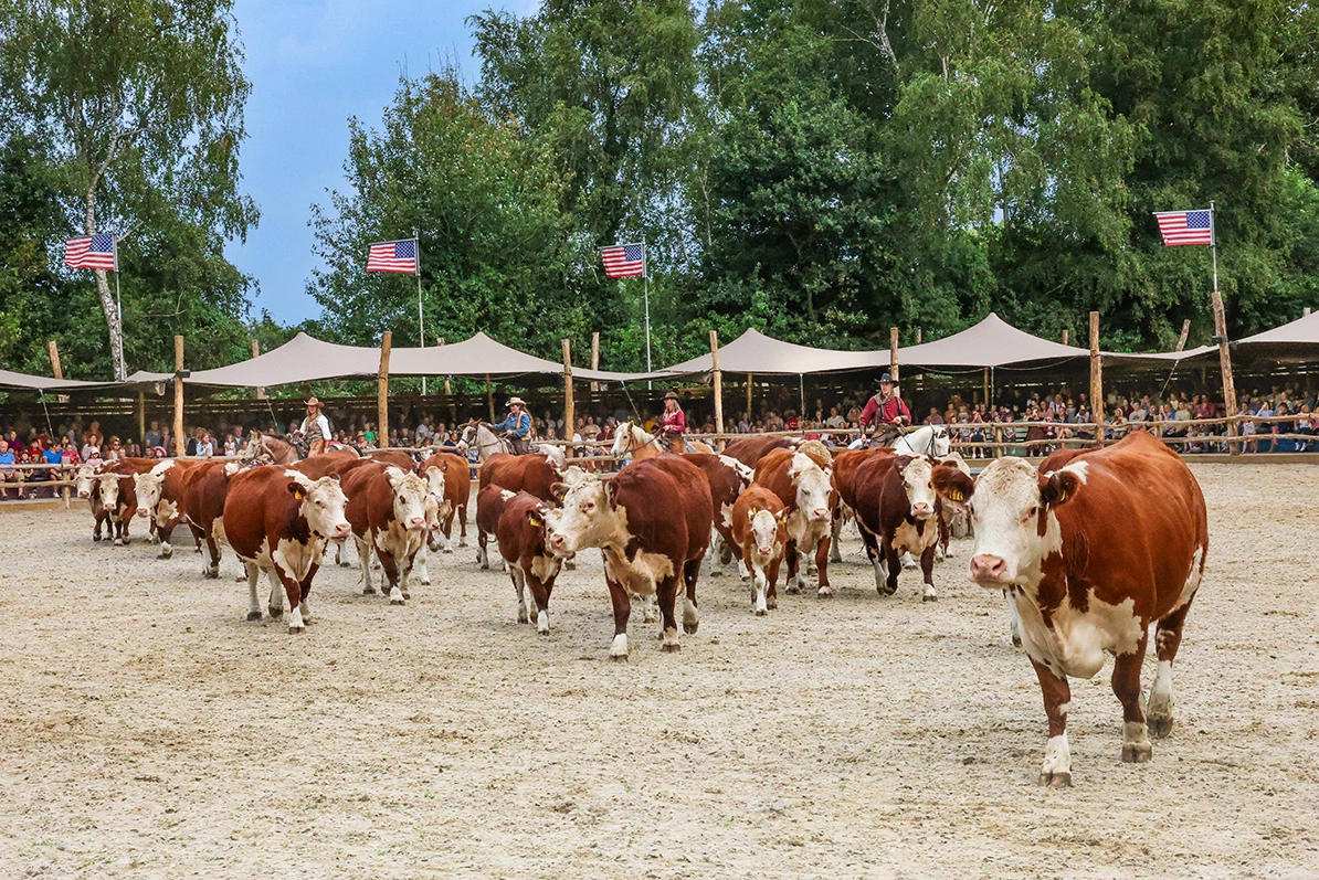 Reist zurück in die Zeit des Wilden Westens. Eine Show mit Pferden, Kühen, Kutschen, Maultieren und echten Cowboys.