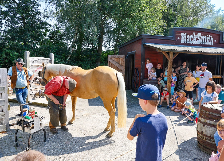 Besuche dem Blacksmith, wo die Cowboypferde auf handwerkliche Weise neue Hufeisen bekommen.