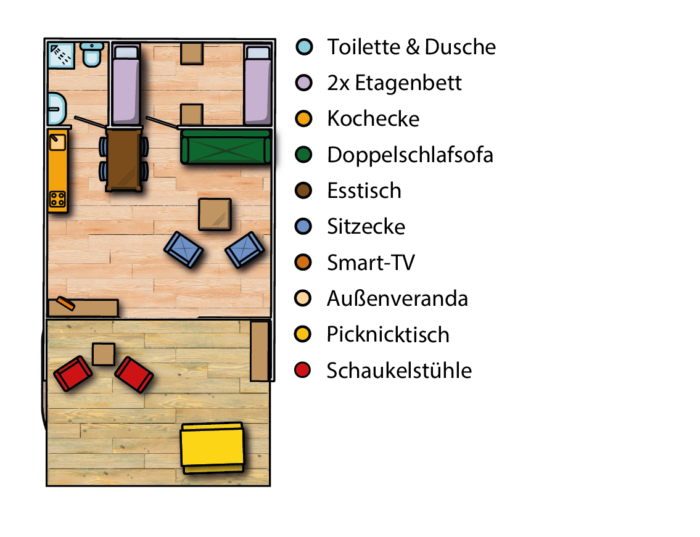 Die Ausstattung ist komplett für einen angenehmen Aufenthalt, mit voll ausgestatteter Küchenecke, Sitzecke, Smart-TV und kostenloses WLAN, Kinderzimmer, Badezimmer und geräumiger Außenveranda mit Picknicktisch, Schaukelstühlen und Cocktailtisch!