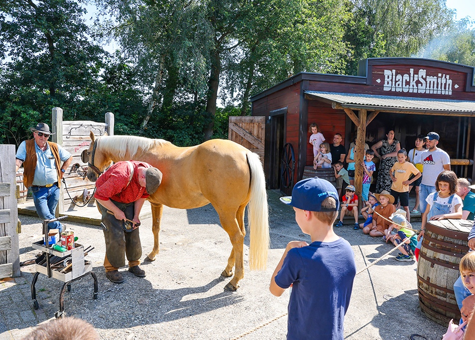 In de Blacksmith krijgt een cowboypaard op ambachtelijke wijze nieuwe hoefijzers.