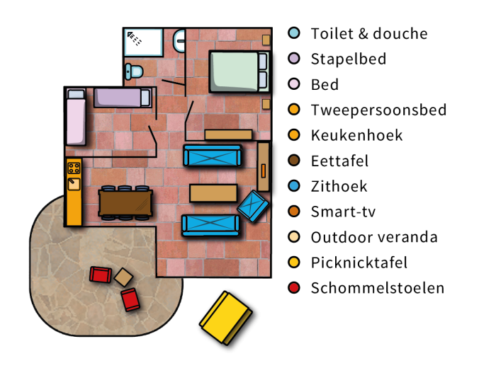 • Volledig ingerichte keukenhoek, zithoek met smart-tv, volwassenen slaapkamer, kinderslaapkamer, badkamer